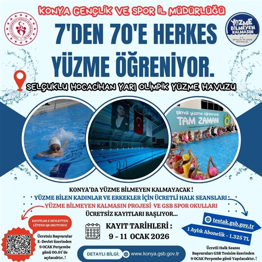 Selçuklu Hocacihan Yarı Olimpik Yüzme Havuzumuzda, “Yüzme Bilmeyen Kalmasın Projesi” kapsamında 16 - 70 Yaş Yetişkinler ve GSB Spor Okulları 7 - 15 yaş Çocuklar için yeni kurslarımız açılıyor.